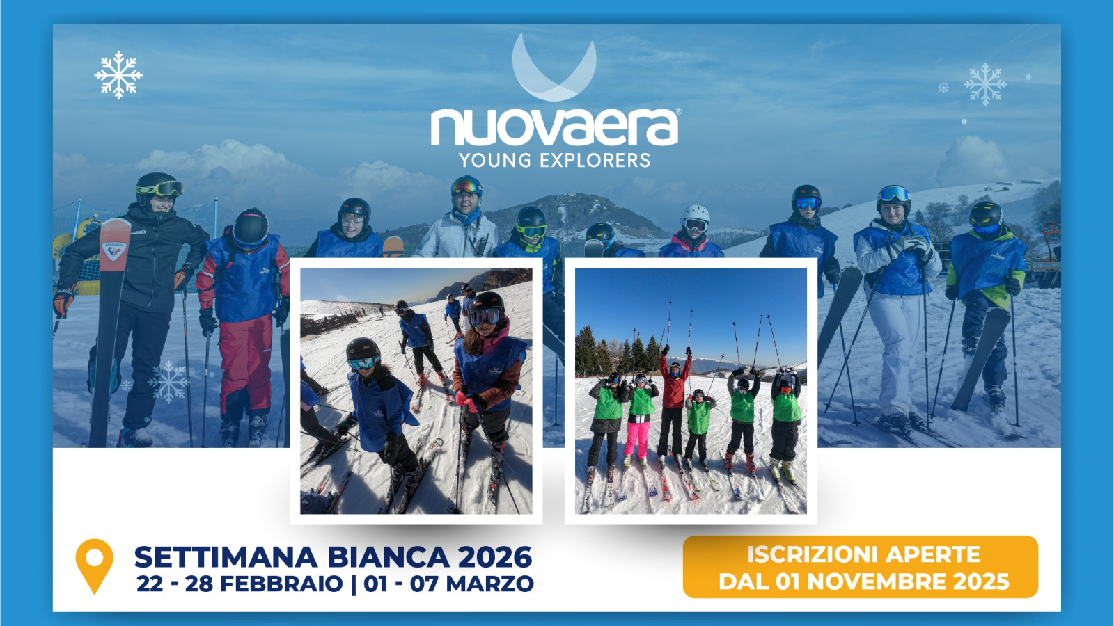 Avremo una scuola sci con i maestri federali a disposizione per tutti, sia per chi della neve è veterano ma anche per quelli che la vedono per la prima volta.Tutto sempre con l’allegria e la presenza costante dello staff NuovaEra. Stiamo per partire: sci ai piedi!