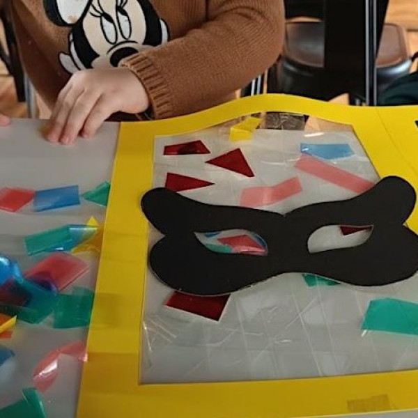 Un laboratorio creativo per immergersi nell'allegria del Carnevale e scoprire come i colori possono trasformarsi grazie alla luce. Insieme ai loro genitori, bambini e bambine daranno vita a un'opera speciale, accostando sagome festose e tonalità vivaci in un gioco di trasparenze e sovrapposizioni. Ogni famiglia realizzerà un quadro magico da appendere alla finestra di casa: una decorazione coloratissima che, catturando i raggi del sole, proietterà riflessi incantati nella stanza, portando tutto lo spirito del Carnevale tra le mura domestiche.